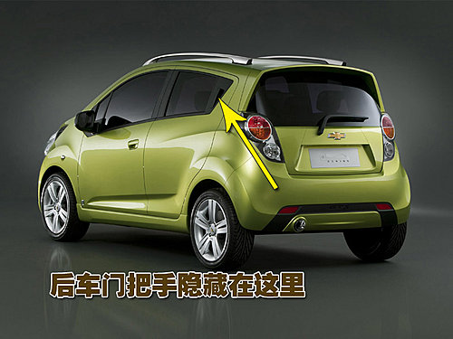 雪佛蘭Beat車型為一款五門掀背車型,該車的設(shè)計(jì)風(fēng)格在科魯茲車型上也有所體現(xiàn)。雖然為一款五門車型,但整體看上去其更像是一款三門版車型,這是因?yàn)樵撥嚨暮箝T門把手放置在C柱上,第一眼看上去很難分別出來。