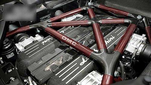 打開(kāi)背部的引擎蓋,可以發(fā)現(xiàn)一個(gè)印有DMC字樣的紅色碳纖加強(qiáng)架,在加強(qiáng)架下的V12引擎經(jīng)過(guò)重新DMC的ECU刷寫(xiě)后,馬力提升至670匹的水平。經(jīng)過(guò)測(cè)速,這臺(tái)Quattro Veloce在0-96的加速時(shí)間只需3.2秒,可見(jiàn)Murcielago強(qiáng)大的改裝潛力。