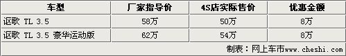 09新款的謳歌TL在去年12月份正式進(jìn)入國內(nèi)市場銷售,相比之前老款車型,09款在外觀、性能、排量上均有不同程度的提升。近日謳歌為了可以更好的適應(yīng)中國市場的需求推出了TL豪華運(yùn)動版車型,售價62萬元。與此同時根據(jù)網(wǎng)上車市價格監(jiān)測系統(tǒng)顯示,目前購買TL均可以得到8萬元的現(xiàn)金優(yōu)惠,其中也包括剛剛推出的豪華運(yùn)動版。具體車型售價見下表: