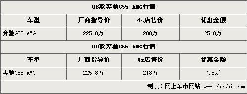根據(jù)北京奔馳4S店銷售人員介紹,目前店內(nèi)可以接受09款奔馳G55 AMG的預(yù)訂,訂金為10萬元,并且近期預(yù)訂奔馳G55 AMG的消費者可以得到7.8萬元的優(yōu)惠,經(jīng)優(yōu)惠后售價從225.8萬元下降到了218萬元。銷售人員還介紹,08款的奔馳G55 AMG還有少量的庫存車,并且有高達(dá)25.8萬元的優(yōu)惠,經(jīng)優(yōu)惠后08款的售價降到了200萬元。