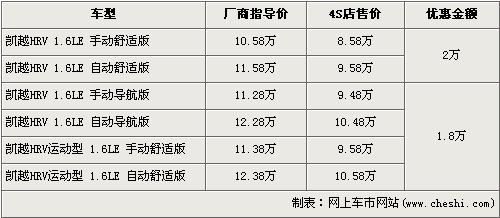 據(jù)經(jīng)銷商處銷售人員介紹,凱越HRV共有6個車型在售,近期除了舒適版現(xiàn)金優(yōu)惠仍然是2萬元外,其他4款車型的均優(yōu)惠1.8萬元。入門車型的凱越HRV 1.6LE 手動舒適版現(xiàn)金優(yōu)惠售價仍為8.58萬元。而導(dǎo)航版與運動版車型優(yōu)惠1.8萬元,但是此兩版車型店內(nèi)均無現(xiàn)車,欲購買的消費者需交訂金1萬元,最早兩周內(nèi)可以提車。