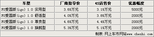 據(jù)比亞迪汽車4S店銷售人員介紹,比亞迪F0愛國版igo系列車型的現(xiàn)車并不是很齊全,實用型和舒適型都有現(xiàn)車,尊貴型和旗艦型則需要預(yù)訂,大概10-15天即可提車。而目前1.0L實用型和舒適型都有現(xiàn)車,其中實用型可以優(yōu)惠5000元,而其他車型只可以優(yōu)惠2000元現(xiàn)金。