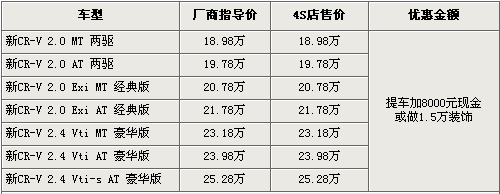 據(jù)4S店銷售人員介紹,目前購(gòu)買本田CR-V仍需要加價(jià)提車,需要加現(xiàn)金8000元或者加1.5萬(wàn)元的全車裝飾,裝飾包括了腳墊、尾翼、行李架、踏板等。消費(fèi)者可根據(jù)需求選購(gòu),但是必須達(dá)到1.5萬(wàn)元的消費(fèi)金額。目前2.0和2.4自動(dòng)檔有黑色、銀色現(xiàn)車供應(yīng),其他特殊顏色還需要預(yù)定。