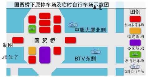 針對(duì)市民關(guān)注的自行車(chē)停放問(wèn)題,CBD管委會(huì)表示,原有的自行車(chē)停車(chē)場(chǎng)將延時(shí)開(kāi)放,同時(shí)就近開(kāi)辟兩處自行車(chē)臨時(shí)停放場(chǎng)地。一處位于原自行車(chē)場(chǎng)地的東北側(cè),中服大廈北側(cè),停放自行車(chē)數(shù)量可達(dá)200輛,與原場(chǎng)地停放數(shù)量相當(dāng)。