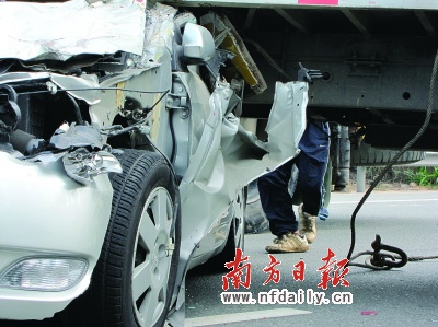 比亞迪轎車上的林先生告訴記者,他們是廣東湛江人,昨天他帶著女朋友和親戚乘坐侄子的小車回老家準(zhǔn)備結(jié)婚。沒想到侄子脾氣不太好,看到貨車司機(jī)在前邊的快車道上不急不慢地行駛,一時(shí)急于超車,結(jié)果不小心發(fā)生了撞車,侄子的眉骨被撞裂,傷勢(shì)稍微嚴(yán)重一些,其他人則是不同程度的輕傷。