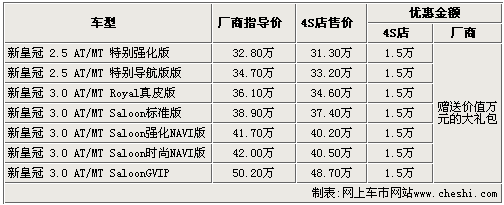 據(jù)一汽豐田銷售人員介紹:隨著新皇冠的即將上市銷售,廠商和4S店均加大了對(duì)老款皇冠的優(yōu)惠力度。目前購(gòu)買這款車的消費(fèi)者不僅可以享受到1.5萬的現(xiàn)金優(yōu)惠,而且廠商還會(huì)隨車贈(zèng)送價(jià)值近萬元的數(shù)碼大禮包。