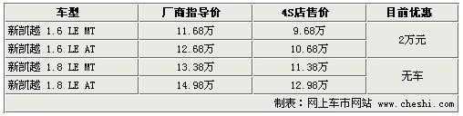 據(jù)4S店銷售人員介紹:目前新凱越分為1.6升和1.8升車型,但目前在售車型只有1.6升手動豪華型和1.6升自動豪華型,1.6升低配車型目前無車,1.8升由于銷量極少,所以廠家不排產(chǎn),也不接受預(yù)訂。目前1.6升車型現(xiàn)車很充足,顏色有白色、銀色、紅色、黑色等,這幾種顏色車型銷量較好。目前新凱越最高可優(yōu)惠2.2萬元,但店內(nèi)無裝飾贈送。