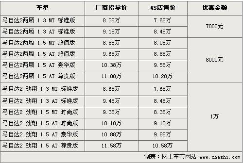 馬自達(dá)2是長安馬自達(dá)繼3系列之后又一定位更加年輕化的城市小車,Mazda2沿襲馬自達(dá)經(jīng)典的“Zoom-Zoom”設(shè)計理念,并同時結(jié)合了優(yōu)異的安全性、舒適性及燃油經(jīng)濟(jì)性表現(xiàn)。根據(jù)網(wǎng)上車市價格監(jiān)測系統(tǒng)顯示,目前全系最高可優(yōu)惠現(xiàn)金1萬元左右,具體行情如下:
