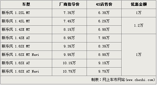 新樂風(fēng)是雪佛蘭旗下的三廂入門級家用車銷售主力,但由于上市多年,消費者對于它也產(chǎn)生了審美疲勞。在今年的5月份,帶有家族新特征的小改款新樂風(fēng)來到世人眼前,外觀的改進讓此車動感不少。近日據(jù)網(wǎng)上車市價格系統(tǒng)檢測顯示,新樂風(fēng)出現(xiàn)了最高1.2萬元的優(yōu)惠,具體價格詳情請看下表: