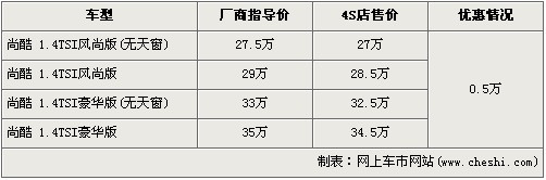 與高爾夫六代同平臺的大眾Scirocco尚酷轎跑車,自從廣州車展上正式發(fā)布后,便引起了眾多車友的關(guān)注。大眾Scirocco尚酷轎跑車采用了大眾IROC概念車的大量設(shè)計元素,激進的外觀給人留下了深刻的印象。大眾Scirocco尚酷轎跑車分為1.4T和2.0T兩種排量車型,先期上市的為1.4T車型。近日據(jù)我走訪北京多家大眾4S店得知,大眾尚酷1.4T全系出現(xiàn)5000元優(yōu)惠,具體車型價格請看下表: