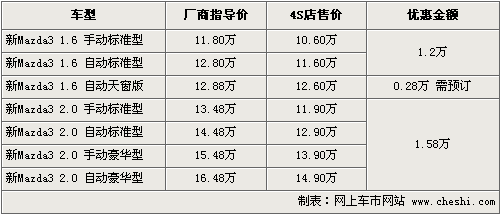 馬自達(dá)3自4月份1.6L的自動天窗版車型上市以來,一直受到消費(fèi)者關(guān)注。運(yùn)動與操控完美結(jié)合讓馬自達(dá)3擁有較好的口碑。根據(jù)網(wǎng)上車市價(jià)格監(jiān)測系統(tǒng)顯示,馬自達(dá)3現(xiàn)最高優(yōu)惠1.58萬元。具體行情如下: