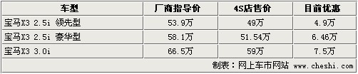 據(jù)4S店銷售人員介紹:目前寶馬X3全系3款車型全部有優(yōu)惠,最高優(yōu)惠7.5萬元。目前X3 2.5i豪華型與3.0i有現(xiàn)車,2.5i豪華型現(xiàn)車顏色有黑色、金色、銀色、灰色、白色,現(xiàn)車比較多顏色較齊全;3.0i車型僅有銀色現(xiàn)車。X3領(lǐng)先型預(yù)定需等到今年底活明年初,如果不著急購買的消費(fèi)者可以等待。目前購買X3任何一款車型,均可獲得原車導(dǎo)航系統(tǒng)。