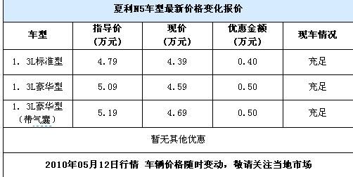 近日,編輯從天津一汽北京中普信4S店解到,夏利N5現(xiàn)車(chē)充足,最高優(yōu)惠5000元。詳情見(jiàn)下表: