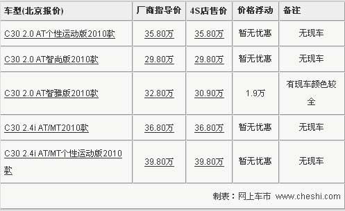 沃爾沃旗下的豪華轎跑車全新改款C30已于3月18日正式在中國上市,憑借著時尚的外觀設計和沃爾沃的品牌影響力,自上市以來受到了廣泛關注。近日網上車市記者也從沃爾沃北京經銷商處了解到,目前C30最高優(yōu)惠1.9萬元,詳情參考下表: