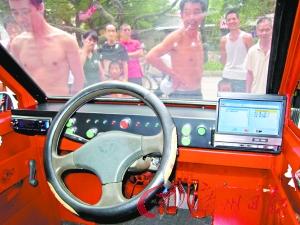 車前的大燈和轉(zhuǎn)向燈,車后的剎車燈和倒車?yán)走_(dá)和正規(guī)的小轎車幾乎沒兩樣,4個車門雖然還沒有裝玻璃,但是門和門框結(jié)合密實(shí)。車內(nèi)前面只有一個駕駛座,駕駛座左手邊是有5個擋位的擋桿,后面是一個可折疊的并排兩座位。一個從“五菱”車上淘來的方向盤控制車的轉(zhuǎn)向,方向盤后是平整的控制臺,上面按了大燈、倒車?yán)走_(dá)、散熱風(fēng)扇和電子打火等不同顏色的按鈕,最讓人驚嘆的是,在操控臺兩邊還安裝了一個可自動伸縮的DVD播放系統(tǒng)。