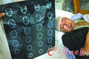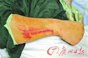 昨天晚上,記者趕到了救治黃國(guó)順的中山三院。當(dāng)時(shí),護(hù)士正在為他換藥包扎傷口,黃國(guó)順指了指床下的染紅藥布,告訴記者這是他妻子剛剛為他擦掉的血跡。