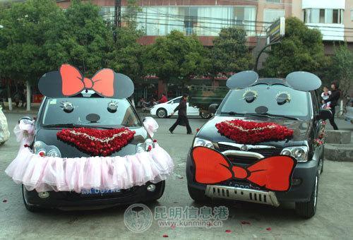 大紅色的蝴蝶結(jié)、黑色靈巧的眼睛、玫瑰花鋪成的鼻子,一輛小型越野車經(jīng)過巧妙的裝扮,變成了可愛的“米老鼠”。一旁,站著“Mickey”的愛人“ MINI[綜述 圖片 論壇]”。粉色的公主紗、車頂戴上蝴蝶結(jié)、滿天星花朵做成長長的睫毛、配上黑黑的大眼睛,比亞迪小車搖身一變成了“MINI”、“Mini”嬌羞地站在“Mickey”旁邊,引得路人駐足觀看。“太可愛了,車子這樣一打扮,都認(rèn)不出原貌了,比奔馳還拉風(fēng),真有創(chuàng)意!”一名男士拿出手機(jī),為兩只可愛的“米老鼠”拍照。兩輛造型可愛的婚車,引來不少路人拍照留念。