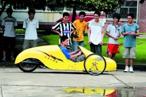 日前,廣西工學(xué)院汽車工程系4名學(xué)生設(shè)計(jì)制成一輛新型環(huán)保車,每百公里耗油僅1.2升。該車最快時速能達(dá)到65公里。這輛環(huán)保車除了發(fā)動機(jī)外,全為手工制作,車身用玻璃鋼材料制成,零件是學(xué)生自己動手焊接而成。該車前輪為兩個自行車輪胎,后輪為摩托車輪胎。整車重量為37.5公斤,造價(jià)不足5000元。