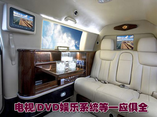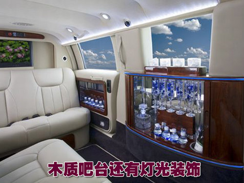上等的真皮裝潢、電視以及DVD娛樂(lè)系統(tǒng)、小型酒吧臺(tái)均是該車(chē)的必要配置,此外其還擁有WiFi 無(wú)線(xiàn)網(wǎng)絡(luò)系統(tǒng)。12伏的電源插口,不銹鋼點(diǎn)綴裝飾的木質(zhì)裝飾吧臺(tái)還有燈光作為點(diǎn)綴。