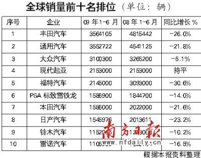 處于危機(jī)中的市場,誰能最低限度地保持自己的跌幅,誰就贏得了市場。近日,美國汽車新聞(AutomotiveNews)公布了2009年上半年各家汽車廠商在全球的銷量資料,現(xiàn)代汽車表現(xiàn)出足夠的抗跌性,已經(jīng)超越福特汽車,爬升至全球老四的位置。而經(jīng)過鳳凰涅槃的通用汽車,上半年的銷量則縮小與豐田的差距,有可能重新奪回世界銷量第一的寶座。目前,在世界排名前10的廠商中,亞洲車企獨(dú)占一半,歐洲車企有3家,美國則只剩下了2家。經(jīng)歷了一場浩劫般的危機(jī)后,世界汽車市場的格局有望重新排列。