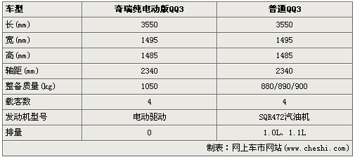 從基本參數來看,純電動版QQ3與普通版QQ3相比,車身尺寸沒有變化,不過在車重上增加了不少,這可以看出電動模塊還是比較重的,當然比較特別的電動QQ3絕對零排放,不過對于電動模塊的參數暫時還沒有,有待進一步的消息發(fā)布。