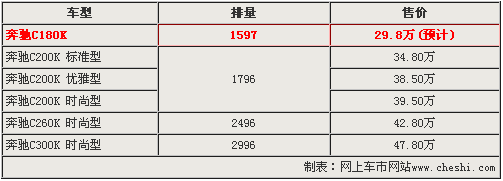 目前,北京奔馳新C級(jí)轎車共有3個(gè)排量五款車型,而入門級(jí)車型奔馳新C200K 標(biāo)準(zhǔn)型的售價(jià)為34.8萬元。由于奔馳新C200K 標(biāo)準(zhǔn)型在經(jīng)銷商處可以優(yōu)惠2萬元左右,所以奔馳新C180K車型作為奔馳新車的入門車型,預(yù)計(jì)售價(jià)為29.8萬元。同時(shí),與售價(jià)分別為28.3萬和29.1萬的寶馬318i和奧迪A4L1.8T形成真正的抗衡。