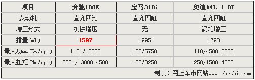 奔馳新C180K車型雖然僅搭載1.6升排量引擎,但其最大功率和扭矩卻高達(dá)115Kw/5200和230Nm/3000-4500,較排量為2.0升的寶馬318i分別高出15 Kw和50 Nm。由于奧迪A4L 1.8T搭載了1.8升燃油直噴渦輪增壓引擎,所以最大功率和扭矩位居三款入門級(jí)車型之首。