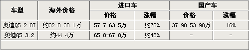 從以上表格中我們可以看到,奧迪Q5在海外的售價(jià)約合人民幣32.8-44.4萬元,旗下的2.0TFSI和3.2FSI車型以進(jìn)口的形式進(jìn)入國(guó)內(nèi)后,價(jià)格分別有了76%和48%的漲幅。但隨后奧迪Q5選擇了國(guó)產(chǎn),以此來降低奧迪Q5的成本和價(jià)格。我們看到,國(guó)產(chǎn)后的奧迪Q5價(jià)格漲幅只有16%,比進(jìn)口車型下降了很多。