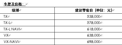 作為舊款VX級(jí)別車型的延續(xù),TX-L級(jí)別配置更加豐富,采用4.0L雙VVT-i的發(fā)動(dòng)機(jī),性能大幅提升。除沿用了舊款VX級(jí)別所配備的主動(dòng)牽引力控制系統(tǒng)A-TRC以及車輛穩(wěn)定控制系統(tǒng)VSC外,還增加了第三排座椅電動(dòng)折疊功能、智能鑰匙及一鍵啟動(dòng)系統(tǒng)、自發(fā)光式儀表盤等,同時(shí),SRS空氣囊也增至7個(gè)。在這種配置下,TX-L級(jí)別的價(jià)格設(shè)定為57.8萬元,比舊款VX級(jí)別的價(jià)格還低7千元。