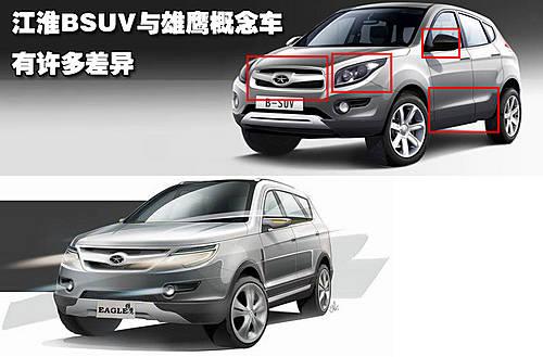 江淮BSUV是以雄鷹概念車為原型打造的一款小型SUV,雖然沒有RAV4那樣的身材,但整車的側(cè)面造型和前引擎蓋的線條都與RAV4非常相似,讓人一眼看上去會(huì)聯(lián)想到縮小了的RAV4。江淮BSUV的外形設(shè)計(jì)非常動(dòng)感時(shí)尚,相信會(huì)迎合國內(nèi)很多消費(fèi)者的胃口。