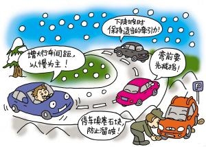 對(duì)于雪地的駕駛技巧,交警部門提醒車主,關(guān)鍵是以“慢”為主,并與前車保持足夠的剎車距離。然而,路況的復(fù)雜,讓很多駕駛員在發(fā)生側(cè)滑時(shí)感到緊張!叭绻囕v打滑,方向盤要順著打滑方向輕輕地轉(zhuǎn),待車輪回正后,再輕輕地踩剎車。”“關(guān)鍵是要慢,平穩(wěn)地減速及輕踩剎車,絕對(duì)不要在冰雪濕滑的路面上猛起步,或緊急剎車!焙汲琴Y深出租車司機(jī)師傅們紛紛提供雨雪天氣駕駛竅門。