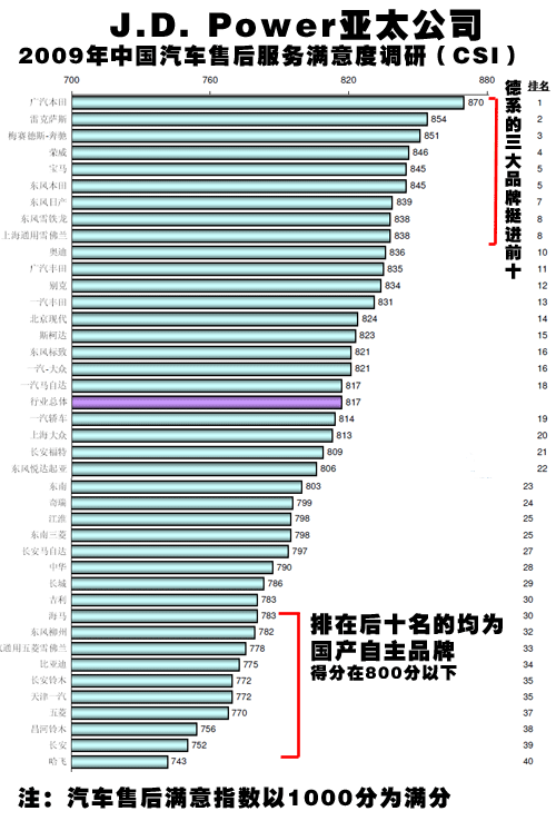 在了解完銷售方面的情況后,我們在來看下消費者最關(guān)注的售后服務(wù)的情況。通過以上08年度與09年度的J.D. Power(亞太公司)中國汽車售后服務(wù)滿意度調(diào)研(CSI)前10名的對比我們可以發(fā)現(xiàn),德系的三大品牌均榜上有名,自主品牌榮威首次上榜就位列第4,而日系品牌新增雷克薩斯與東風(fēng)日產(chǎn)。而08年度排名第7的奧迪排名跌至第10名。