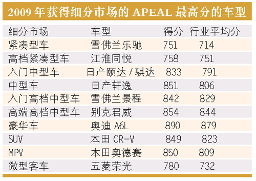 此外,本土品牌提升也較為明顯,緊湊型車和高檔緊湊型車兩個級別的前三名基本上由本土品牌收入囊中。但由于油價(jià)飛漲,人們對緊湊型車的要求也越來越高,因此今年的緊湊型車的APEAL成績比去年下降了22分。