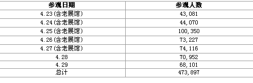 經(jīng)2010北京國(guó)際車(chē)展秘書(shū)處統(tǒng)計(jì),截止到2010年4月29日17:30,本屆北京國(guó)際車(chē)展新老展館參觀人員數(shù)量如下: