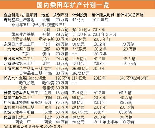 如此龐大的產(chǎn)能擴(kuò)充計(jì)劃讓相關(guān)各方憂心忡忡。今年年初,工信部向國(guó)內(nèi)車企下發(fā)了《關(guān)于調(diào)查汽車生產(chǎn)企業(yè)投資項(xiàng)目有關(guān)情況的通知》,通知要求車企上報(bào)現(xiàn)有產(chǎn)能情況和2010年~2015年產(chǎn)能規(guī)劃和投資情況。市場(chǎng)的火爆讓“產(chǎn)能過(guò)剩”的憂患呼聲逐漸熄滅,對(duì)部分廠家而言,最核心的任務(wù)仍然是增加產(chǎn)能。