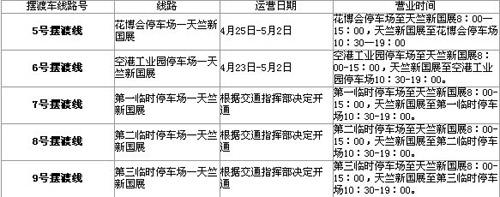 喜歡自駕車的朋友們,新國(guó)展在花博會(huì)設(shè)立了專門的停車場(chǎng),大家可以把車停到這里然后乘坐車展的擺渡車直接前往展館。擺渡車的路線和運(yùn)營(yíng)時(shí)間如下表: