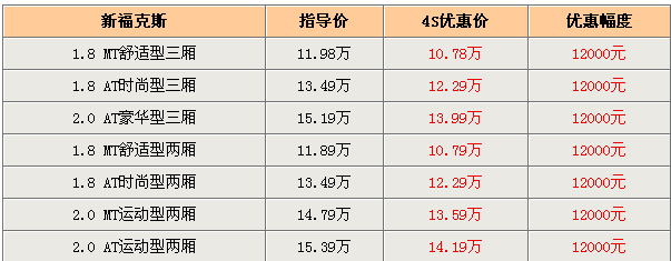 筆者日前走訪北京長安福特4S店時獲悉,目前新?怂箖(yōu)惠又提升2000元,全系優(yōu)惠1.2萬元,由于新嘉年華的上市,商家為了留出庫存故加大了新?怂沟淖尷