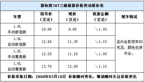 近日,筆者走訪北京雙龍雅致東風標致4S店時了解到,目前店內(nèi)的307三廂1.6L車型優(yōu)惠有所加大,目前手動擋車型可以優(yōu)惠1萬元,自動擋車型可以優(yōu)惠1.1萬元,店內(nèi)現(xiàn)車充足,顏色也很齊全,詳細價格信息請見下表: