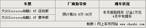 與六代高爾夫同平臺的大眾Scirocco尚酷轎跑車,自從在廣州車展上正式發(fā)布以后,引起眾多車友的極大關注,這款車采用了大眾IROC概念車的大量設計元素,是一款既彰顯時尚前衛(wèi)的運動氣質又能滿足駕駛者日常功能需求的全能轎跑車。根據(jù)網(wǎng)上車市價格監(jiān)測系統(tǒng)顯示,目前尚酷展車已經(jīng)到店,本月底現(xiàn)車也將陸續(xù)到店,4S店開始接受消費者預訂,具體行情如下: