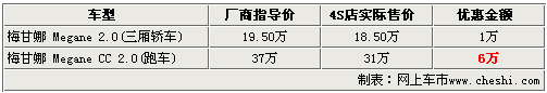 與雪鐵龍、標致同為法系知名汽車制造商的雷諾,以進口方式引進國內的車型有風景、梅甘娜以及拉古娜等多款車型。其中梅甘娜車型分為三廂版本和跑車兩個版本。近日根據(jù)網(wǎng)上車市價格檢測系統(tǒng)顯示,梅甘娜全系車型均出現(xiàn)了價格松動,三廂普通版車型可優(yōu)惠1萬元,而跑車版梅甘娜的優(yōu)惠幅度達到6萬具體車型售價見下表: