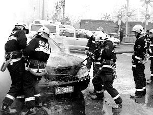 消防員對(duì)起火的轎車進(jìn)行撲救。