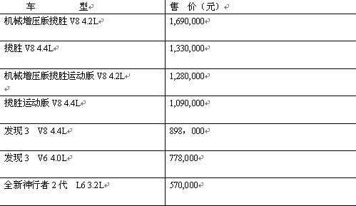 中新網(wǎng)11月8日電 近日,記者獲悉,路虎主力產(chǎn)品08款攬勝運動版正式登陸北京、華北、西北、西南市場,其中4.4升V8汽油自然進(jìn)氣版價格為109萬元,4.2升V8機(jī)械增壓版價格為128萬元。經(jīng)銷商處現(xiàn)已接受預(yù)訂,訂金為5萬元。