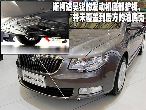 斯柯達昊銳的發(fā)動機下方護板面積同樣比較小,發(fā)動機油底殼位置下方?jīng)]有被護板覆蓋。但是其下護板的斜坡起設計也能夠?qū)Πl(fā)動機油底殼起到一定的保護作用。