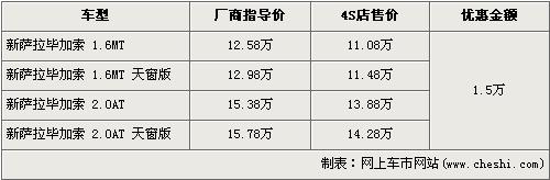 據(jù)4S店銷(xiāo)售人員介紹,現(xiàn)在消費(fèi)者購(gòu)買(mǎi)新薩拉畢加索可優(yōu)惠現(xiàn)金1.5萬(wàn)元。新薩拉畢加索分為1.6L和2.0L兩種排量,1.6L車(chē)型分為手動(dòng)和手動(dòng)天窗兩款車(chē)型,經(jīng)優(yōu)惠后售價(jià)分別降為了11.08萬(wàn)元和11.48萬(wàn)元。2.0L車(chē)型分為自動(dòng)和自動(dòng)天窗版,經(jīng)優(yōu)惠后售價(jià)分別降到了13.88萬(wàn)元和14.28萬(wàn)元。銷(xiāo)售人員還介紹,2.0L車(chē)型店內(nèi)有現(xiàn)車(chē),而1.6L車(chē)型需消費(fèi)者交1萬(wàn)元訂金約等一個(gè)月才可提車(chē)。