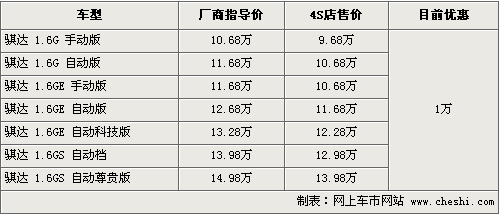 騏達(dá)一直是東風(fēng)日產(chǎn)系列車型中最為暢銷的車型之一,同時也是在同級別車型中表現(xiàn)最為突出的車型之一,自上市以來受到眾多消費者的喜愛。根據(jù)網(wǎng)上車市價格監(jiān)測系統(tǒng)顯示,目前這款車現(xiàn)車比較緊張,購車的消費者可享受1萬元的現(xiàn)金優(yōu)惠,具體行情如下: