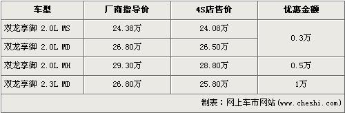 憑越野車起家的雙龍,向來(lái)是以生產(chǎn)SUV而著稱的,旗下的雙龍享御更是其的代表之作,其2.0L車型搭載的柴油發(fā)動(dòng)機(jī)更是源于奔馳的技術(shù)。雙龍享御共有四款車型,售價(jià)區(qū)間為24.38萬(wàn)元-29.30萬(wàn)元。近日根據(jù)網(wǎng)上車市價(jià)格監(jiān)測(cè)顯示,雙龍享御全系最高優(yōu)惠1萬(wàn)元,詳情請(qǐng)看下表: