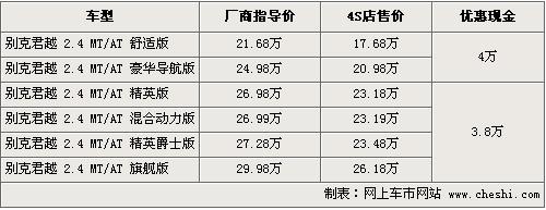 別克君越一直是中高級(jí)車市最受關(guān)注的車型之一,這款車搭載了全球普及率較高的ECOD-VVT2.4L全鋁智能發(fā)動(dòng)機(jī),并配以6速手自一體變速箱,在動(dòng)力上比老款有非常大的提升。根據(jù)網(wǎng)上車市價(jià)格監(jiān)測系統(tǒng)顯示,目前君越優(yōu)惠已過4萬元,具體車型和價(jià)格如下: