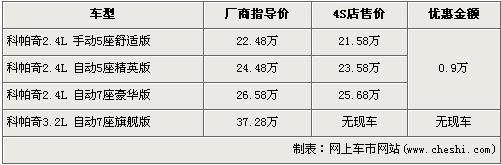 科帕奇車型分為2.4L與3.2L兩種排量,2.4L手動(dòng)五座舒適版和2.4L七座手自一體豪華版兩款車型先期上市,2.4L 5座精英版和3.2L排量的車型隨后也上市銷售,全車系售價(jià)區(qū)間為22.48萬(wàn)元-37.28萬(wàn)元。近期根據(jù)網(wǎng)上車市價(jià)格監(jiān)測(cè)顯示,科帕奇2.4L車型全系優(yōu)惠9000元,具體詳情請(qǐng)看下表: