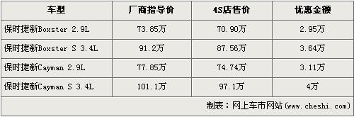 據(jù)北京保時捷4S店銷售人員介紹,由于去年的經(jīng)濟危機席卷全球,以至于全球的經(jīng)濟形勢都不容樂觀。在去年下半年,保時捷的北美以及德國本土銷量都下降了不少,所以在2009年保時捷力爭以價格優(yōu)勢搶占中國的超跑市場。為了表示率先占領中國超跑市場的決心,于近期上市的新Boxster和新Cayman兩款經(jīng)典超跑在上市之際便打出降價牌-全系優(yōu)惠9.6折。經(jīng)折扣轉換成現(xiàn)金后,排量同為2.9L的新Boxster和新Cayman售價立即從廠商指導價分別降為了70.90萬元和74.74萬元,而動力更加強勁,排量同為3.4L的新Boxster S和新Cayman S經(jīng)優(yōu)惠后售價也分別降為了87.56萬元和97.1萬元。