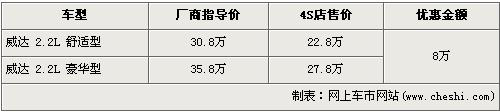 據(jù)經(jīng)銷商銷售人員介紹,威達(dá)全系現(xiàn)金優(yōu)惠8萬元。目前歐寶威達(dá)僅2.2L舒適版和2.2L豪華版兩款車型在銷售,經(jīng)優(yōu)惠8萬元后,2.2L豪華型售價降到了27.8萬元,2.2L舒適型首次跌破23萬,售價僅為22.8萬元。現(xiàn)車的數(shù)量一般顏色也不是很齊全,消費者挑選的余地很受限制。